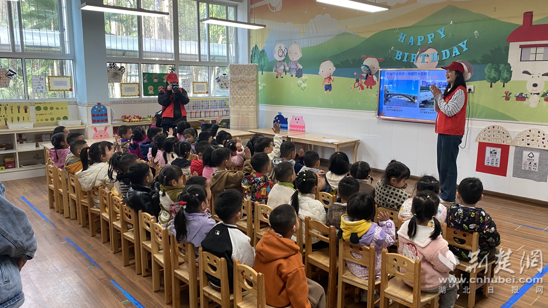 “一道長虹落江面,人來車往很方便;不怕風吹和雨打,交通運輸做貢獻。小朋友們請你們猜一猜,這說的是什么呀?”。伴隨著謎語游戲開場,小朋友們開始了一場愉快的橋梁探索之旅?!按蠼憬恪笔紫葟闹袊糯拇竺麡虺霭l(fā),用通俗易懂的語言,給孩子們介紹了中國橋梁發(fā)展歷史和橋梁知識,在力與美的交融輝映下,小朋友對中國橋梁文化與偉大成就有了感性認識。一張張精美的橋梁圖片,一串串有趣的小小問題,引得孩子們熱情高漲,爭先恐后舉手回答,現(xiàn)場氣氛十分熱烈。