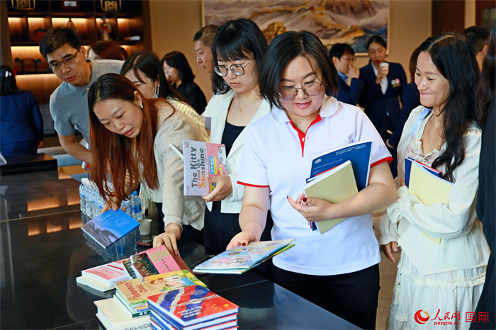 與會(huì)學(xué)生拿取現(xiàn)場(chǎng)贈(zèng)書(shū)。人民網(wǎng)記者 白元琪攝