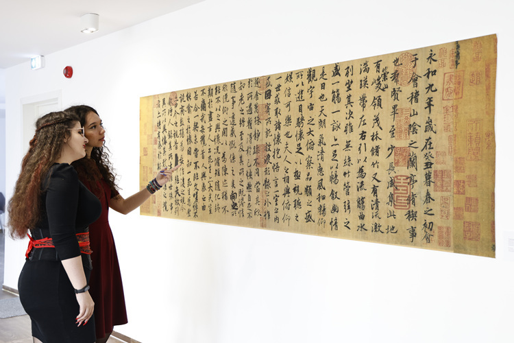 嘉賓在觀看《蘭亭集序》圖片展。布加勒斯特中國(guó)文化中心供圖