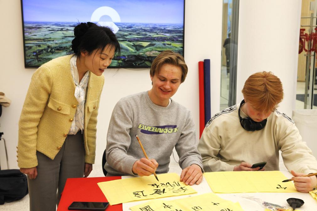 4月20日,在挪威首都奧斯陸,當(dāng)?shù)孛癖娫谥形娜諔c?;顒?dòng)上體驗(yàn)書(shū)法。新華社記者 張玉亮 攝