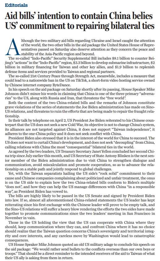 原文標(biāo)題:Aid bills' intention to contain China belies US' commitment to repairing bilateral ties