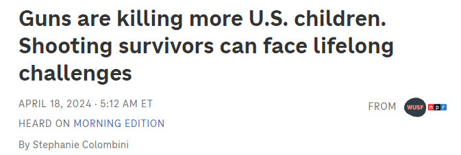 據(jù)美國全國公共廣播電臺報道,2023年6月22日,13歲的亞倫·亨特(Aaron Hunter)在與朋友玩耍時頭部中彈。幸運(yùn)的是,子彈沒有擊中要害,他沒有癱瘓,也沒有失明,但是槍傷導(dǎo)致他視野缺損,在走路時會失去平衡。在2023年,亞倫是因槍傷在美國兒童??漆t(yī)院接受治療的15個兒童患者之一,而在2019年因槍傷在該醫(yī)院救治的兒童只有5個。如今,2024年才過了三個月,已有5個孩子因槍傷送往該醫(yī)院救治。