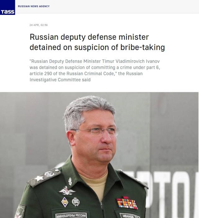中新網(wǎng)4月24日電 據(jù)塔斯社報道,俄羅斯偵查委員會當(dāng)?shù)貢r間23日表示,俄國防部副部長鐵木爾·伊萬諾夫因涉嫌受賄被拘留。
