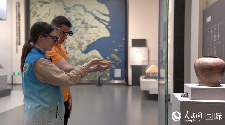 人民網(wǎng)外籍專家在良渚博物院體驗(yàn)AR眼鏡。人民網(wǎng)記者 袁蒙攝