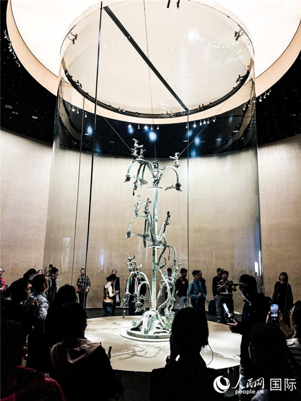 三星堆博物館展出的高3.96米、重360斤的一號青銅神樹,是國內(nèi)外迄今發(fā)現(xiàn)同時(shí)期最大的青銅神樹。人民網(wǎng)記者 羨江楠攝