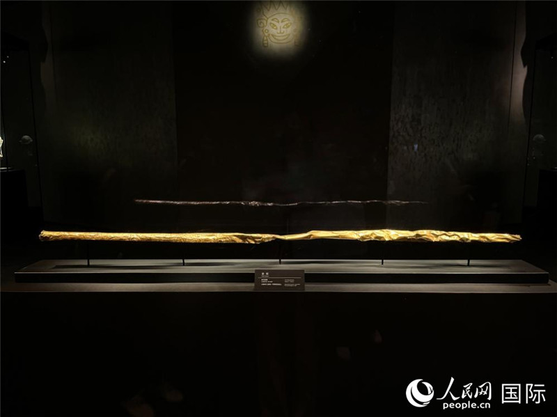 三星堆博物館展出的金杖,全長143厘米,重463克,是目前國內(nèi)所出土的商代最重的金器。人民網(wǎng)記者 羨江楠攝