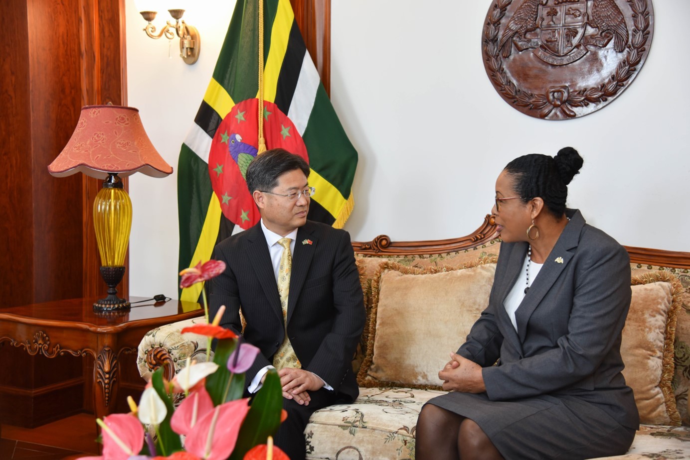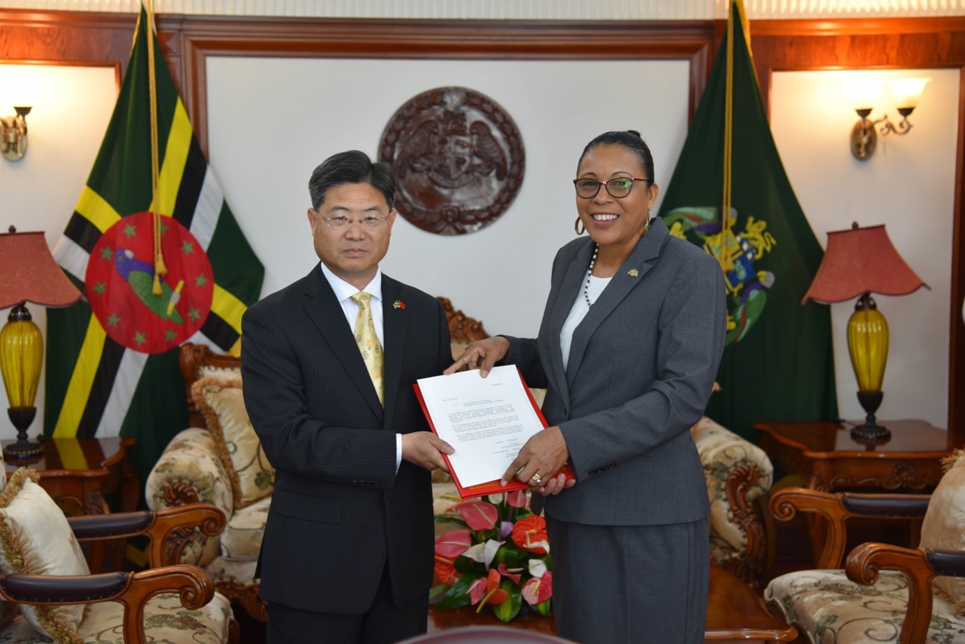 當(dāng)?shù)貢r間5月3日,中國新任駐多米尼克大使儲茂明(左)向多總統(tǒng)伯頓遞交國書。 中國駐多米尼克大使館供圖