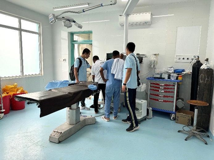 王林醫(yī)生與當?shù)蒯t(yī)生、工程師討論麻醉機的使用與維護。中國(江蘇)第33期援桑給巴爾醫(yī)療隊供圖