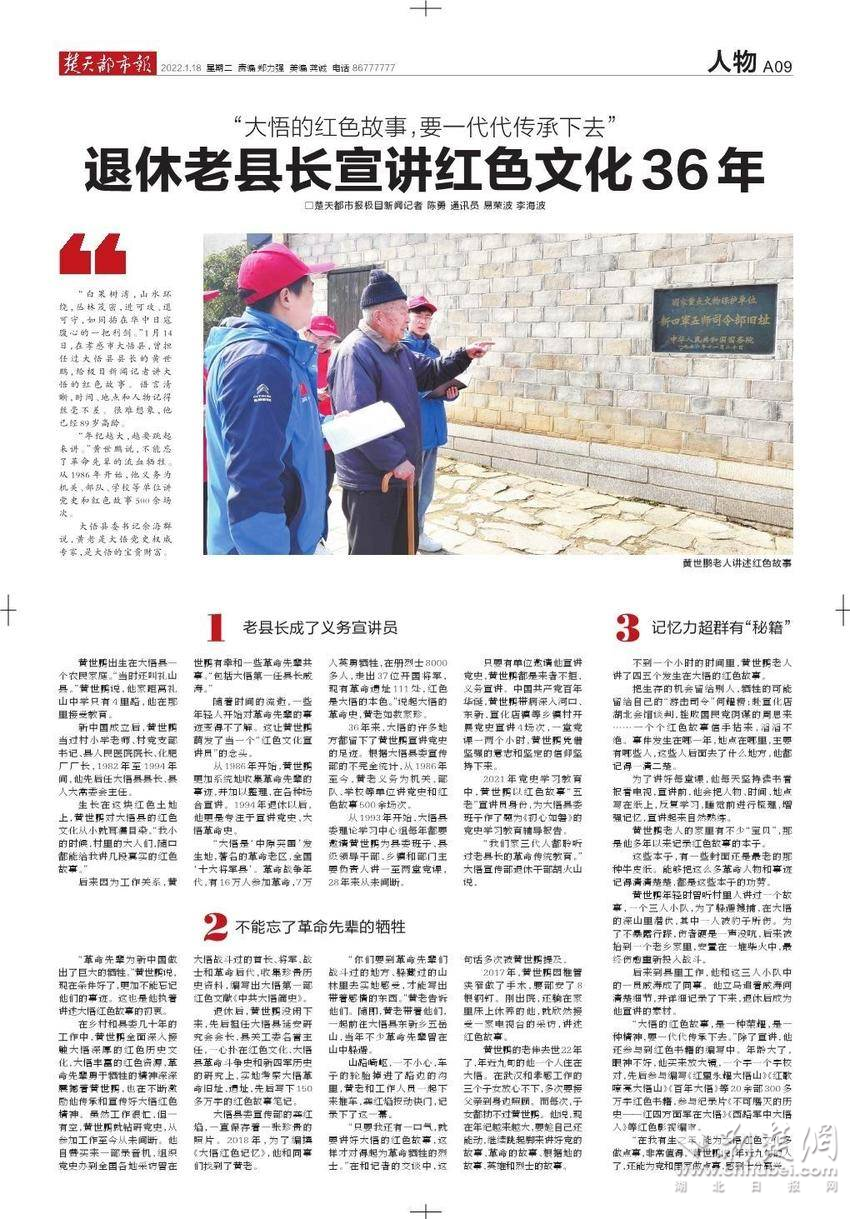 從1986年開始,無論是在工作崗位上,還是退休后,只要有機會,黃世鵬就向干群講述大悟革命故事和紅色歷史,傳承紅色基因,這一講就是38年。