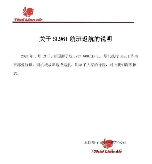 央視網(wǎng)消息:據(jù)泰國(guó)獅航公眾號(hào)消息,5月15日泰國(guó)獅航發(fā)布關(guān)于SL961航班返航的說(shuō)明,2024年5月13日,泰國(guó)獅航B737-800/HS-LUH號(hào)機(jī)執(zhí)行SL961濟(jì)南至曼谷廊曼航班,因機(jī)械故障造成返航。該航司對(duì)此致歉。