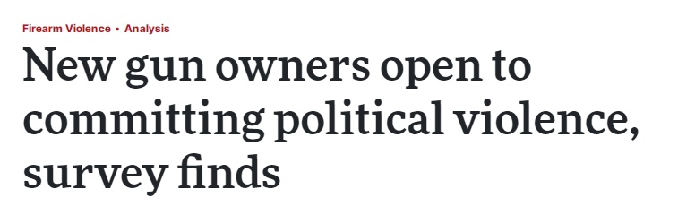 通過對(duì)其中近6000名槍支擁有者的調(diào)查,并對(duì)他們擁有的槍支類型、最近的購買時(shí)間以及在公共場(chǎng)合攜帶上膛槍支的頻率進(jìn)行比較發(fā)現(xiàn),槍支擁有者、沒有槍支的人和最近購買槍支的人之間存在明顯差異,最近購買槍支的人愿意參與政治暴力的可能性更高。