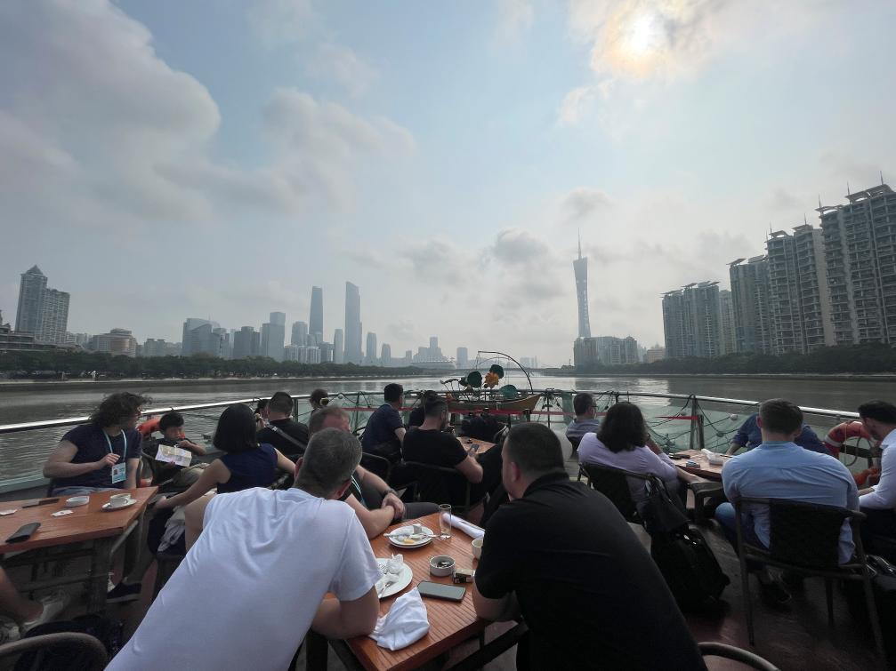 4月15日,采購商從入住的白天鵝賓館乘坐定制接駁交通船前往第135屆廣交會(huì)場館。新華社記者霍思穎攝
