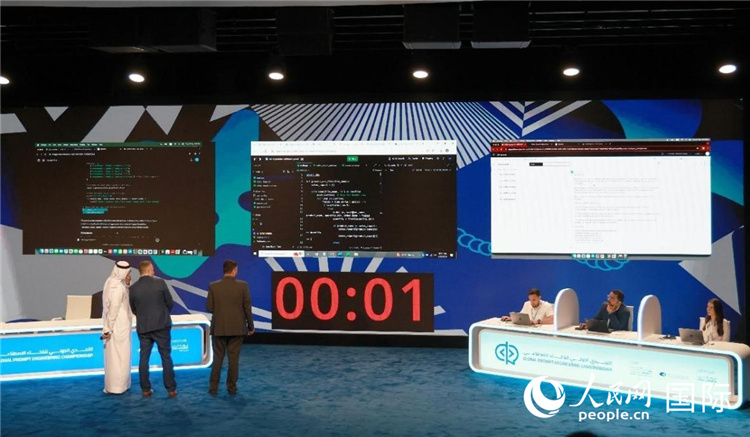 圖為編程類(lèi)決賽場(chǎng)景。三名選手需要在10分鐘內(nèi)完成特定任務(wù)。人民網(wǎng)記者 管克江攝