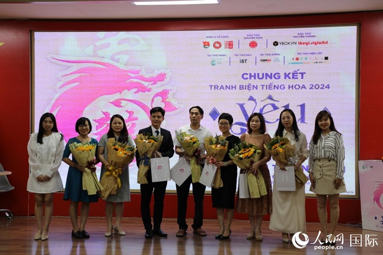辯論賽開(kāi)始前,越方評(píng)委和各參賽高校中文系學(xué)者接受獻(xiàn)花。人民網(wǎng)記者 楊曄攝