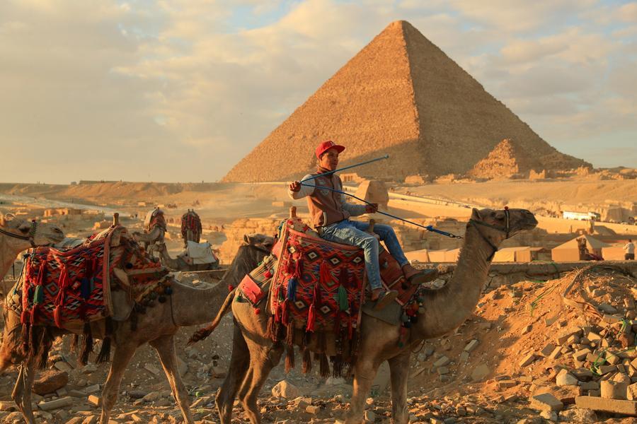 1月24日,商販騎駱駝離開埃及吉薩金字塔景區(qū)。新華社記者 隋先凱 攝