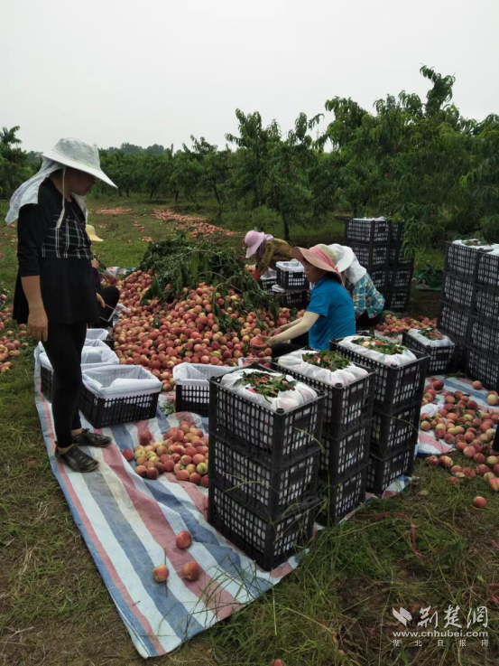 5月29日,在楊店鎮(zhèn)園藝場(chǎng)的桃園里,果農(nóng)們正在果園里穿梭采摘成熟的桃子,桃園里一片繁忙景象。附近的代收點(diǎn)、交易市場(chǎng)也是車水馬龍、人聲鼎沸,幾十名村民正將鮮桃按照大小、重量、顏色分揀,準(zhǔn)備打包裝箱,運(yùn)輸桃子的車輛正在排隊(duì)等待收購(gòu)。