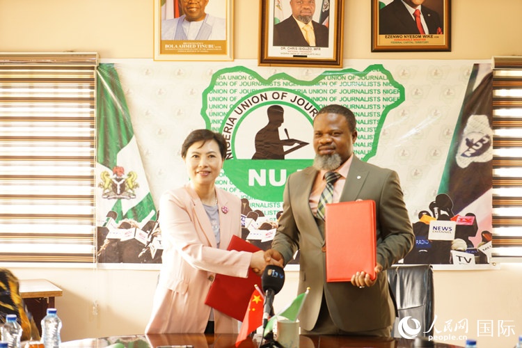 中華全國新聞工作者協(xié)會代表吳旭和尼日利亞記者聯(lián)合會代表克里斯就共建“中尼記者之家”機(jī)制續(xù)簽合作備忘錄。人民網(wǎng)記者 姜宣攝