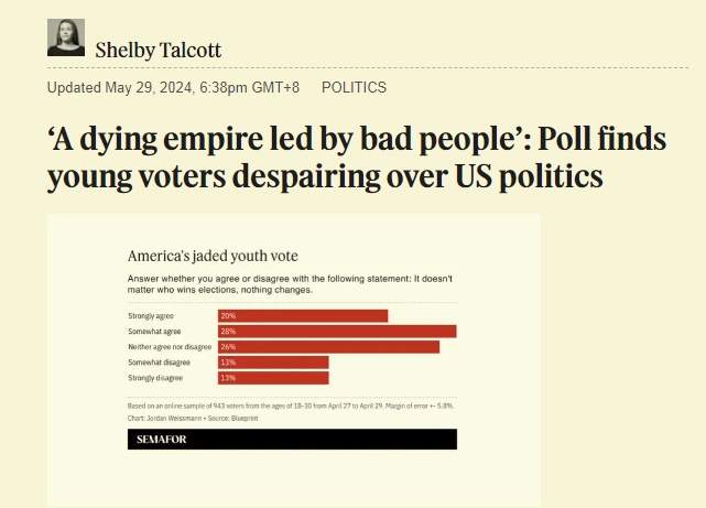“Blueprint”的首席民調(diào)專家史密斯在評論民調(diào)時表示:“年輕選民在我們的政治制度中看不到任何好人。他們看到的是一個由壞人領(lǐng)導的垂死帝國?!?/p>
