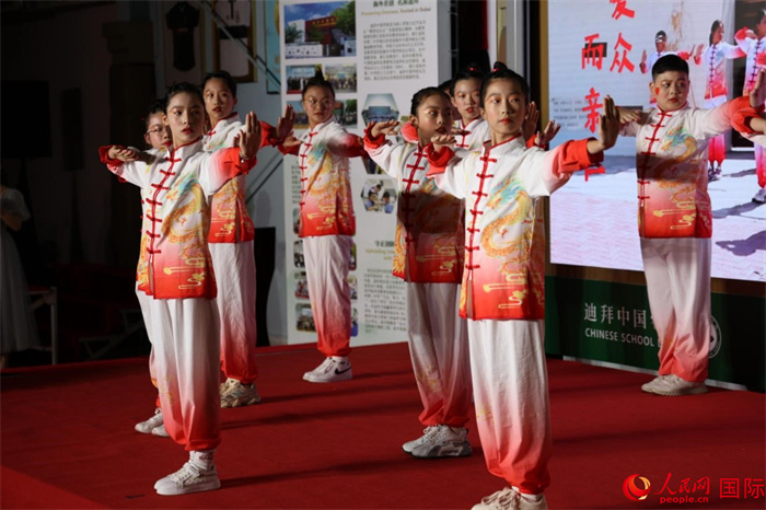 迪拜中國學(xué)校學(xué)生表演《弟子規(guī)》武術(shù)健身操。人民網(wǎng)記者 張志文攝