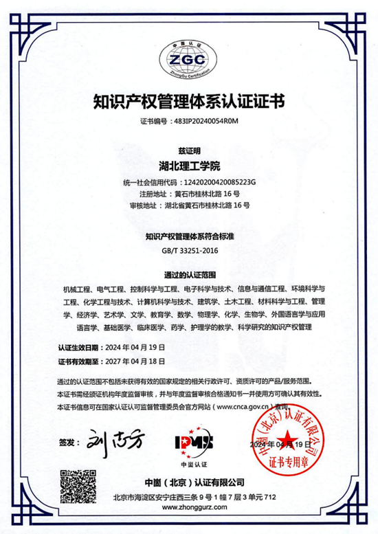 今年3月26日至29日,中崮(北京)認(rèn)證有限公司派出專家組進(jìn)駐該校,通過(guò)個(gè)別訪談、實(shí)地走訪、資料查閱等方式展開現(xiàn)場(chǎng)審核和對(duì)標(biāo)驗(yàn)收。經(jīng)審核考察,專家組對(duì)湖北理工學(xué)院知識(shí)產(chǎn)權(quán)管理工作給予了高度肯定,并一致同意該校通過(guò)知識(shí)產(chǎn)權(quán)管理體系認(rèn)證。