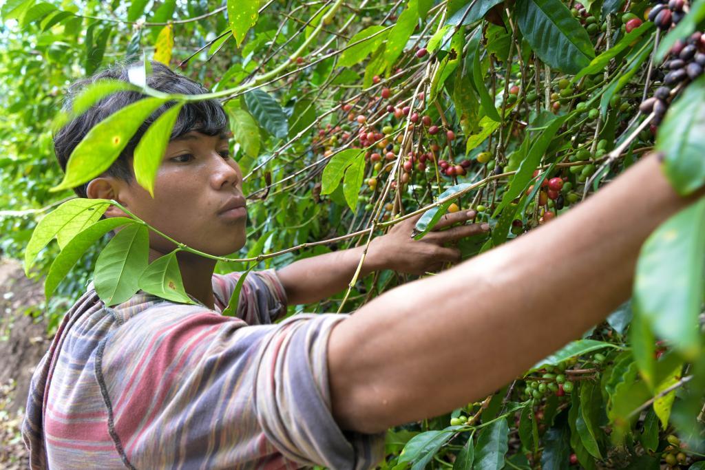 2月19日,在位于巴拿馬奇里基省博克特地區(qū)的彼德松家族莊園內(nèi),一名工人在采摘咖啡豆。新華社記者陳昊佺攝