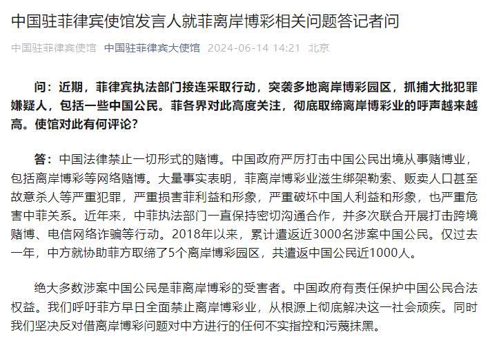 問(wèn):近期,菲律賓執(zhí)法部門(mén)接連采取行動(dòng),突襲多地離岸博彩園區(qū),抓捕大批犯罪嫌疑人,包括一些中國(guó)公民。菲各界對(duì)此高度關(guān)注,徹底取締離岸博彩業(yè)的呼聲越來(lái)越高。使館對(duì)此有何評(píng)論?