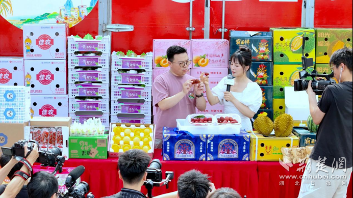 活動(dòng)現(xiàn)場(chǎng),設(shè)置了農(nóng)特產(chǎn)品展示區(qū)和電商直播區(qū)。在直播區(qū),首衡集團(tuán)跟京東集團(tuán)合作設(shè)立的京東超市“家鄉(xiāng)好味”直播間開(kāi)啟首場(chǎng)直播,直播達(dá)人向觀眾展示、介紹血桃、米酒、榴蓮等農(nóng)特產(chǎn)品,并送出福利好貨大禮包;孝感文旅達(dá)人還向大家推薦了孝感農(nóng)特產(chǎn)品、著名文旅景點(diǎn),宣傳孝文化。在農(nóng)特產(chǎn)品展示區(qū),首衡城商戶(hù)代表向線上線下觀眾介紹了無(wú)核荔枝、榴蓮、菠蘿蜜等首衡好物,吸引現(xiàn)場(chǎng)觀眾品嘗購(gòu)買(mǎi)。