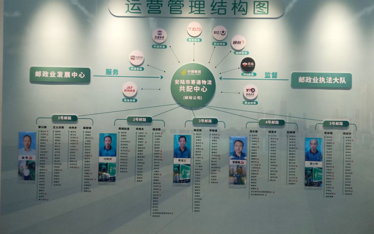 安陸市錨定打造“孝感領(lǐng)先、全省一流”目標(biāo),頂格推進、高效運行、黨建引領(lǐng)、助推產(chǎn)業(yè),構(gòu)建開放惠民、集約共享、安全高效、雙向暢通,可持續(xù)經(jīng)營農(nóng)村寄遞物流體系,實現(xiàn)健康、有序、全面市場化運行,以中國郵政安陸公司為基礎(chǔ),聯(lián)合京東物流、中通快遞、申通快遞、極兔速遞、韻達快遞、德邦物流、圓通快遞、丹鳥快遞八家民營快遞企業(yè),建立安陸市寄遞物流一庫七中心。即:城鄉(xiāng)冷鏈物流配送倉庫;黨員服務(wù)中心;郵政業(yè)發(fā)展中心;智能分揀中心;視頻調(diào)度中心;農(nóng)產(chǎn)品展示中心;電商中心;快遞小哥服務(wù)中心及277個村級服務(wù)站,形成全市“寄遞物流進出村”工程的核心節(jié)點,并與上述快遞企業(yè)統(tǒng)一簽訂代投協(xié)議,實現(xiàn)節(jié)點網(wǎng)絡(luò)共享、末端服務(wù)共配、運力資源共用。全力打造“安順達”品牌,全面助力鄉(xiāng)村振興。