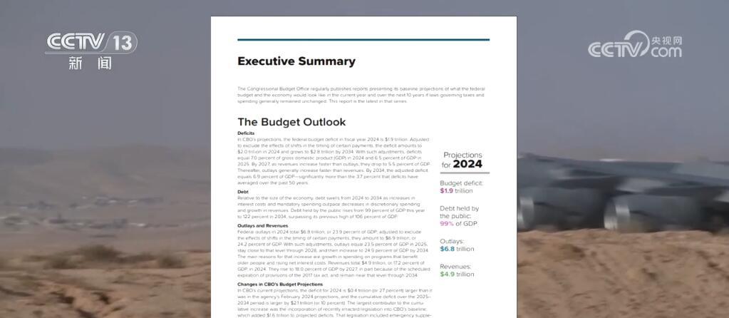 央視網(wǎng)消息:美國國會預(yù)算辦公室18日發(fā)布報(bào)告稱,在2024財(cái)年,聯(lián)邦政府預(yù)算赤字預(yù)計(jì)將達(dá)到1.9萬億美元。