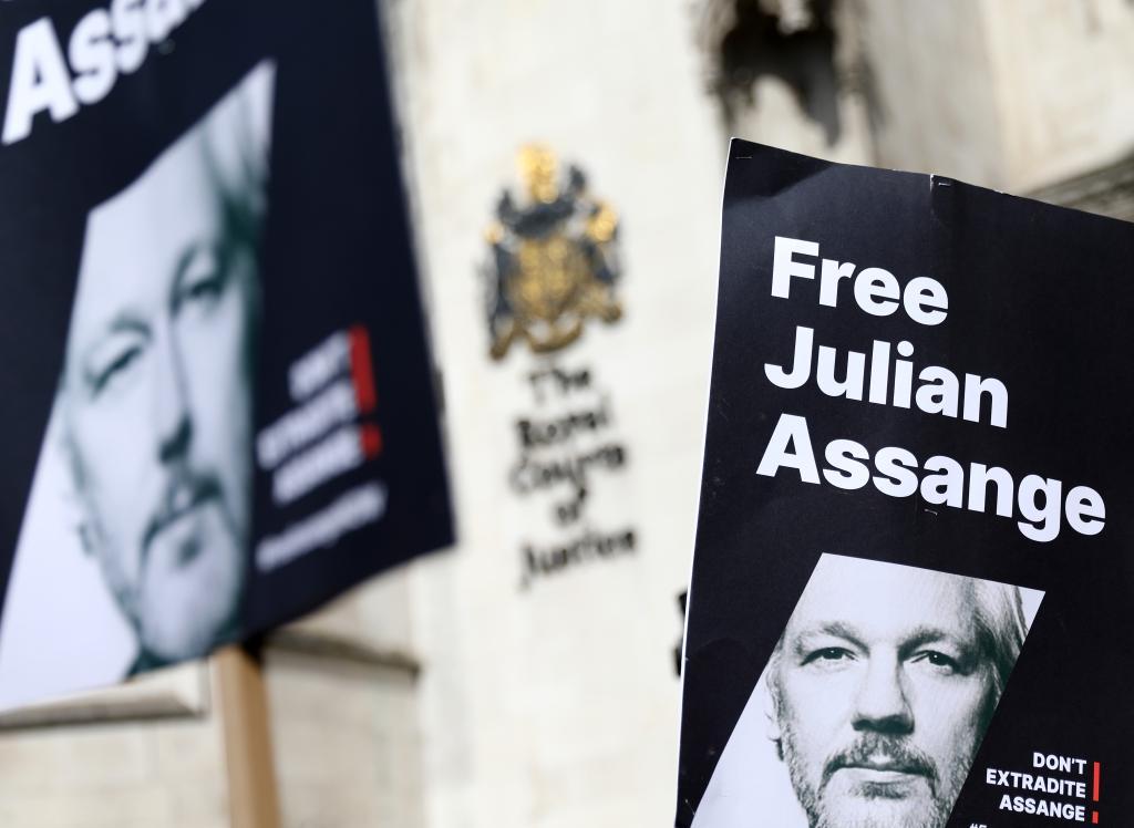 這是3月26日在位于倫敦的英國高等法院外拍攝的寫有“釋放阿桑奇”的標(biāo)語牌。(新華社記者李穎攝)