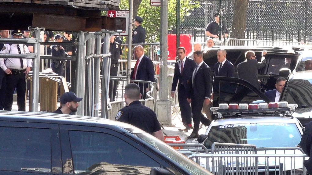 這張4月15日的視頻截圖顯示,美國前總統(tǒng)特朗普抵達紐約曼哈頓一家刑事法院出庭。新華社記者 丁曄 攝