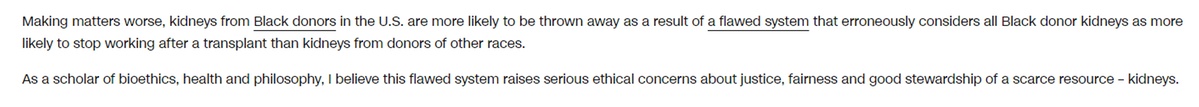 伊爾蒂斯在文章中提道,美國(guó)的器官移植系統(tǒng)利用腎臟捐獻(xiàn)者檔案指數(shù)對(duì)捐獻(xiàn)的腎臟進(jìn)行評(píng)級(jí),該算法除了捐獻(xiàn)者的年齡、身高、體重、高血壓和糖尿病病史等因素之外,還包括捐獻(xiàn)者的種族。而一項(xiàng)對(duì)過往移植的研究稱,某些來自非裔捐獻(xiàn)者的腎臟在移植之后可能比其他種族捐獻(xiàn)者的腎臟更快停止工作。