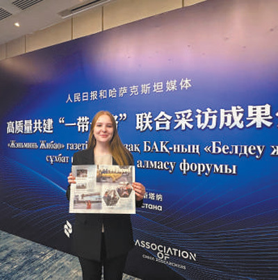 今日哈薩克斯坦通訊社記者科利佐娃手持印有聯(lián)合采訪報道的人民日報版面。本報記者 白陽攝