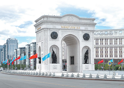 哈薩克斯坦首都阿斯塔納凱旋門旁,中哈兩國國旗迎風(fēng)飄揚(yáng)。本報記者 張朋輝攝