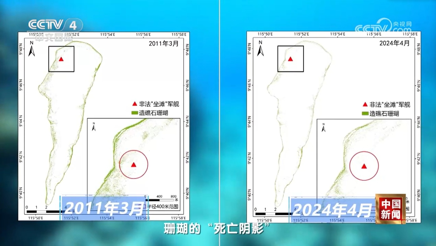 1999年以來,菲律賓軍艦在仁愛礁非法“坐灘”,嚴重侵犯中國領土主權和海洋權益。有關科學調查報告顯示,該軍艦在“坐灘”過程中毀滅性破壞珊瑚礁,船體銹蝕破損析出重金屬抑制珊瑚生長,艦上人員生活和菲方人員捕撈等還對仁愛礁珊瑚礁生態(tài)系統(tǒng)造成持續(xù)損害。