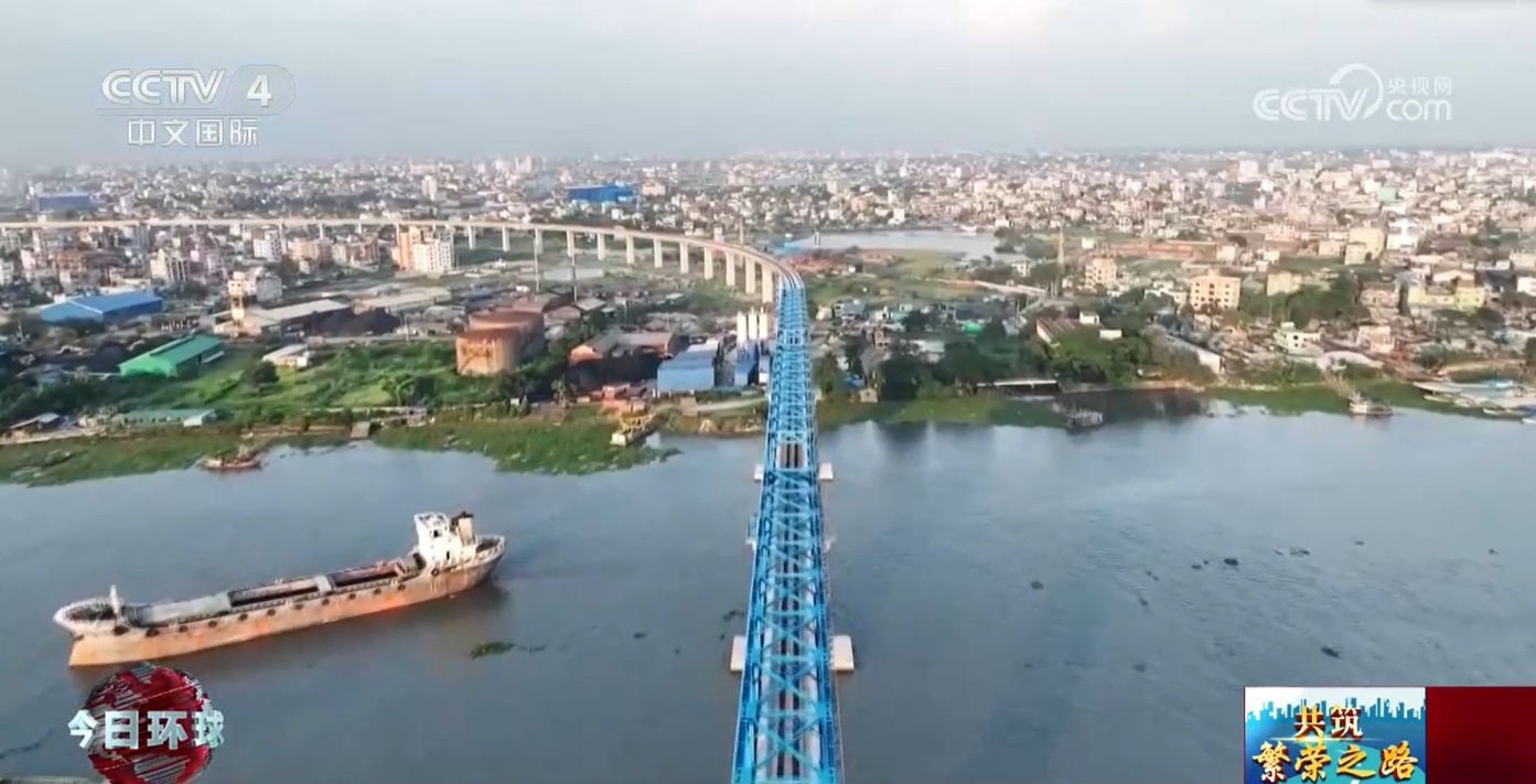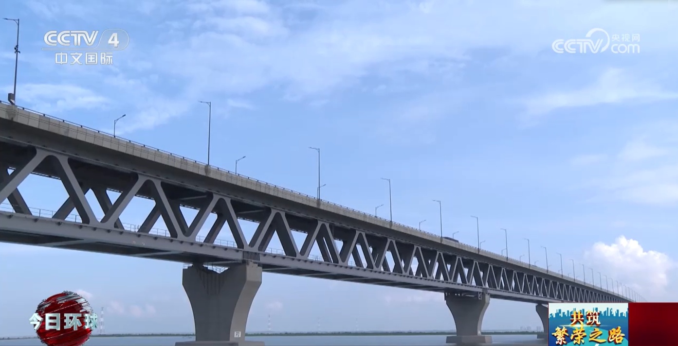 總臺央視記者張劍介紹:“全長7.7公里的帕德瑪大橋現(xiàn)在已經(jīng)成了孟加拉國最具標志性的建筑。從它的外觀我們就能看出來,它是采用了一個雙層鋼桁梁結構,上層是一個四車道的公路,下層是一個單線的鐵路。它的建成也結束了孟加拉國南部21個區(qū)和首都達卡之間過去只能依靠輪渡往來的歷史,當?shù)孛癖娨步o它起了一個很好聽的名字,叫作‘夢想之橋’?!?/p>