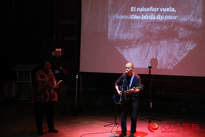 中國歌手蘇陽在第三十四屆麥德林國際詩歌節(jié)開幕式上演唱中文歌曲,南非詩人莫卡蒂加入表演。人民網(wǎng)記者 時元皓攝