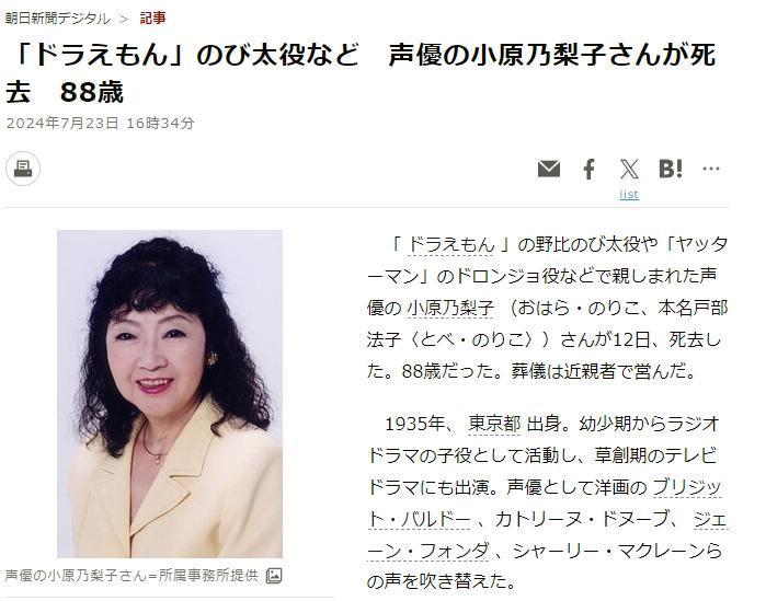 中新網(wǎng)7月23日電 據(jù)日本《朝日新聞》7月23日?qǐng)?bào)道,日本著名配音演員小原乃梨子于7月12日去世,終年88歲。