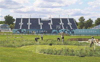 7月17日,工作人員在2024年巴黎奧運(yùn)會馬術(shù)賽場布置場內(nèi)景觀。新華社記者 賀長山攝
