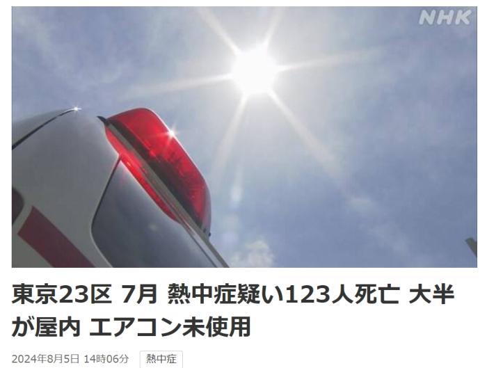 中新網(wǎng)8月5日電 據(jù)日本廣播協(xié)會(NHK)8月5日報道,根據(jù)日本東京都監(jiān)察醫(yī)務院的最新統(tǒng)計,東京都23區(qū)7月總共有123人因中暑死亡。