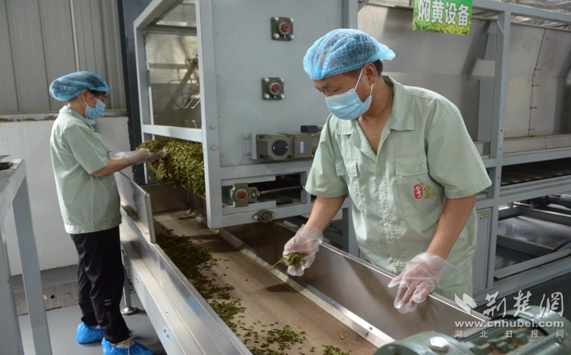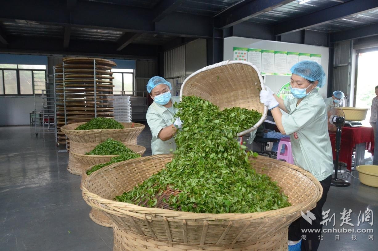 山上茶香四溢,山下?lián)尅磅r”加工。在朱灣村湖北紅綠黃茶業(yè)有限公司(以下簡稱紅綠黃公司)的茶葉加工生產(chǎn)車間內(nèi),村民剛采摘的鮮葉都會被集中送到這里。經(jīng)過三燜三烘、發(fā)酵提香等工藝后,濃郁撲鼻、黃醇干爽的黃茶便新鮮出爐。