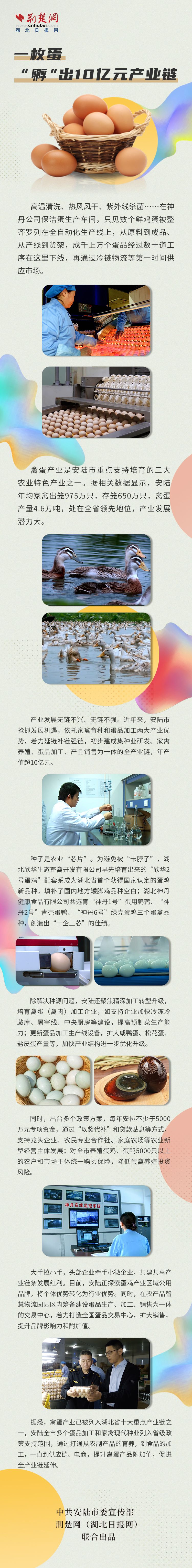 禽蛋產(chǎn)業(yè)是安陸市重點支持培育的三大農(nóng)業(yè)特色產(chǎn)業(yè)之一。近年來,安陸市搶抓發(fā)展機遇,依托家禽育種和蛋品加工兩大產(chǎn)業(yè)優(yōu)勢,著力延鏈補鏈強鏈,初步建成集種業(yè)研發(fā)、家禽養(yǎng)殖、蛋品加工、產(chǎn)品銷售為一體的全產(chǎn)業(yè)鏈,年產(chǎn)值超10億元。