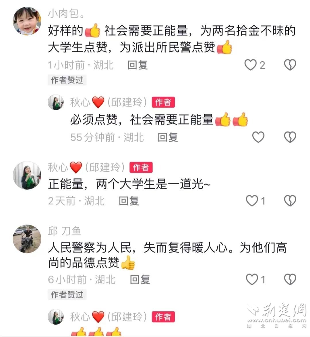 “ 感謝兩位品德高尚的大學(xué)生,感謝民警的辛勤付出,你們的善舉讓我心中倍感溫暖與安心……愿我們的社會(huì)因?yàn)橛心銈冞@樣的好人和好警察而更加美好!”