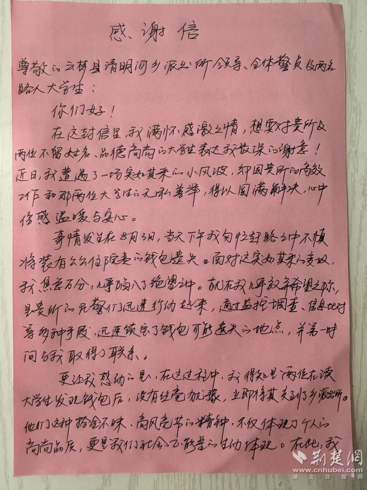 荊楚網(wǎng)(湖北日?qǐng)?bào)網(wǎng))訊( 通訊員 楊婷婷 宋珣)“在這封信里,我滿懷感激之情想要對(duì)貴所,及兩位不留姓名品德高尚的大學(xué)生表達(dá)我最深的謝意……”