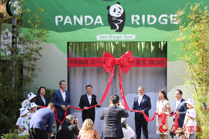 中國(guó)駐美國(guó)大使謝鋒、加州州長(zhǎng)紐森、圣迭戈市市長(zhǎng)格洛利亞等人共同為“熊貓嶺”開館剪彩。人民網(wǎng)記者 李志偉攝