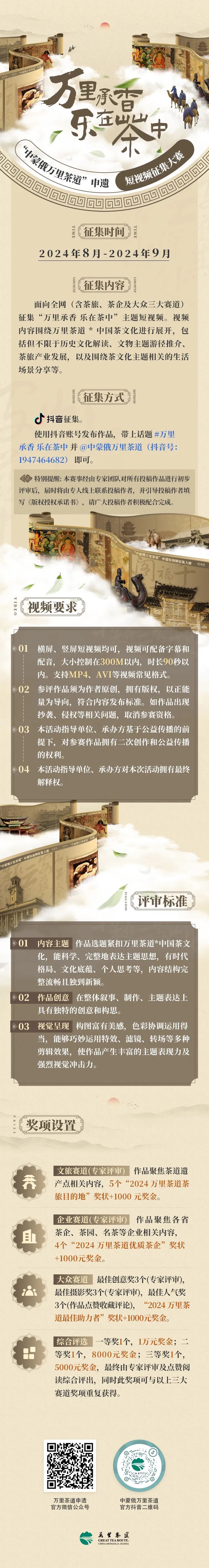 為弘揚(yáng)中華茶文化,講好萬(wàn)里茶道故事,“萬(wàn)里承香 樂(lè)在茶中”萬(wàn)里茶道抖音短視頻征集大賽,今起(8月11日)正式啟動(dòng)!
