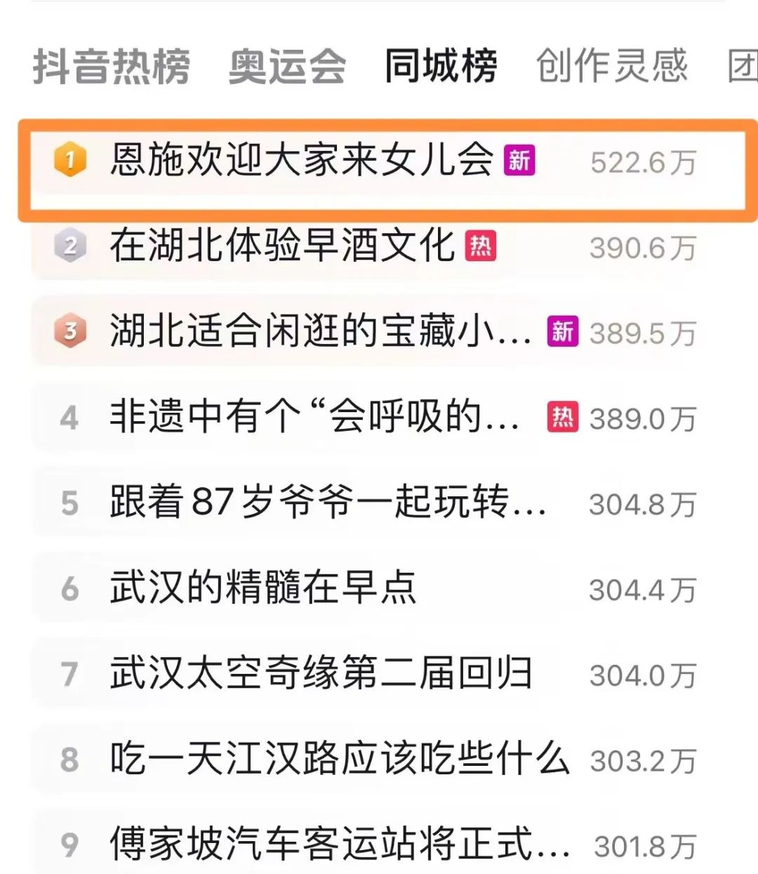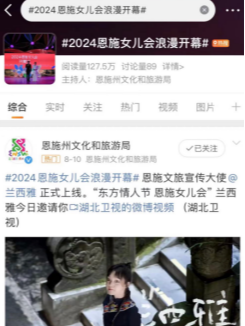 微博話題#2024恩施女兒會浪漫開幕#登陸微博熱搜榜,位居同城話題榜第二名,話題瀏覽量127萬+;恩施籍影視演員、歌手蘭西雅拍攝主題宣傳片,助力恩施女兒會#歡迎大家來恩施女兒會#沖上抖音同城熱榜榜一,話題瀏覽量達(dá)522萬,充分調(diào)動話題熱度,吸引更多游客前來參與。