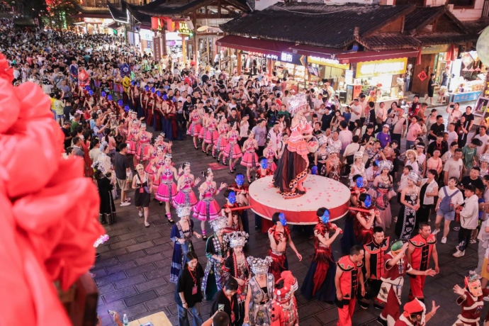 七天七夜的全民同樂活動,演員們一路走一路演,游客們跟隨演員的步伐,踏入一場場流動的盛宴,近距離領(lǐng)略恩施州六縣二市的特色非遺節(jié)目,移步換景,行進(jìn)傳情,共赴親密的文化之旅。