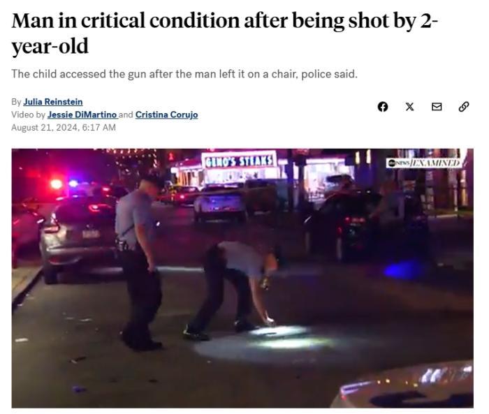中新網(wǎng)8月21日電 綜合美媒報(bào)道,美國警方稱,日前,弗吉尼亞州一名男子被2歲兒童意外開槍擊中,目前處于危急狀態(tài)。