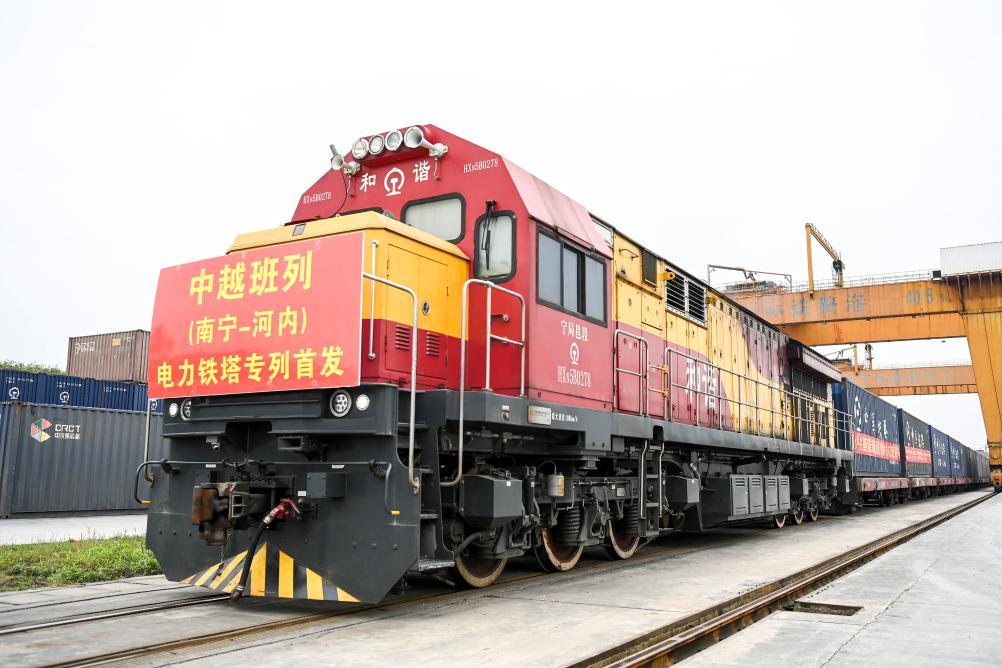 3月8日,在南寧國際鐵路港,電力鐵塔專列準備發(fā)車。3月8日上午,一列滿載340噸電力鐵塔的中越班列從廣西南寧國際鐵路港開出,發(fā)往越南河內(nèi)。這是廣西首次開行電力鐵塔專列。新華社記者曹祎銘 攝